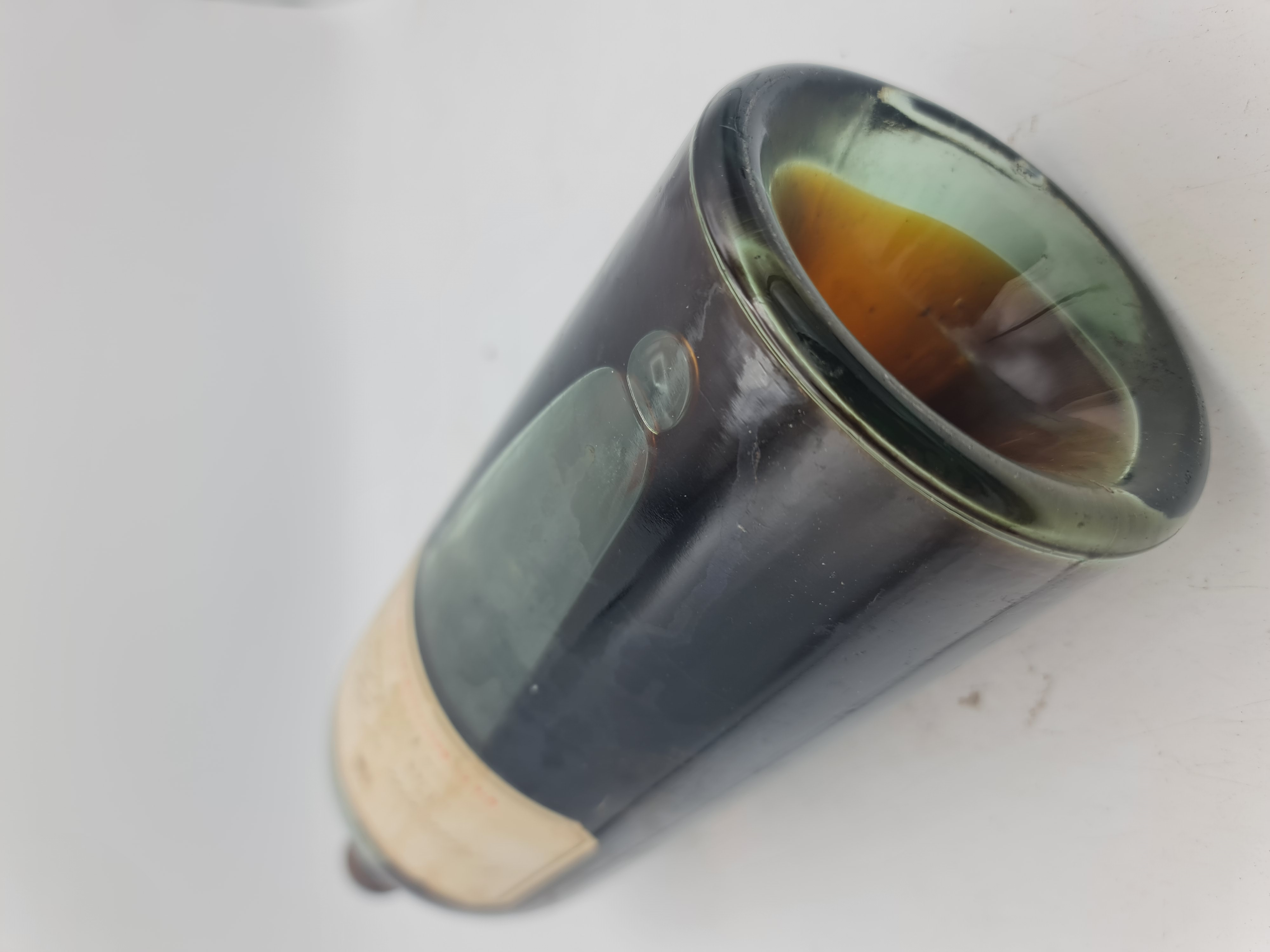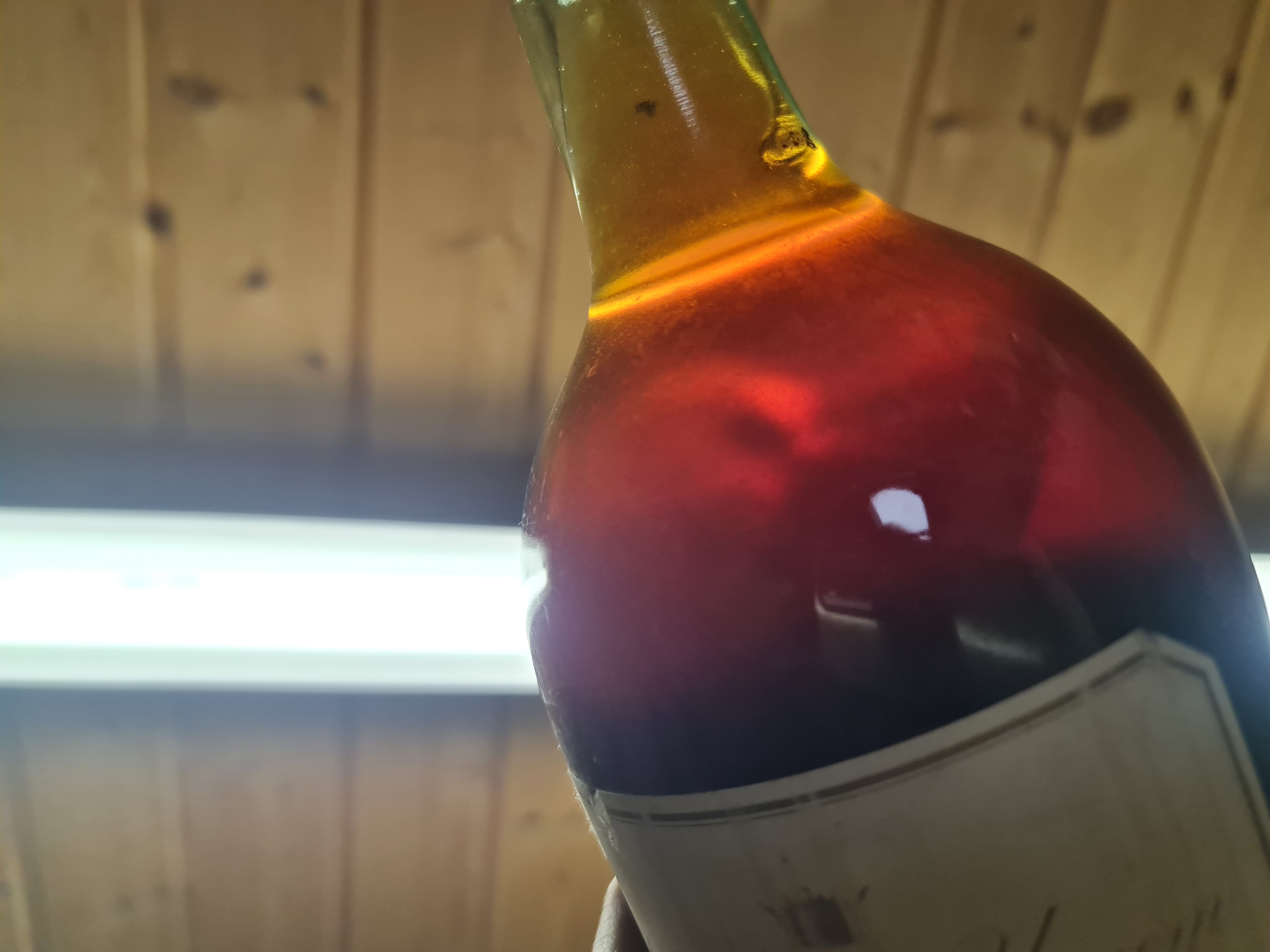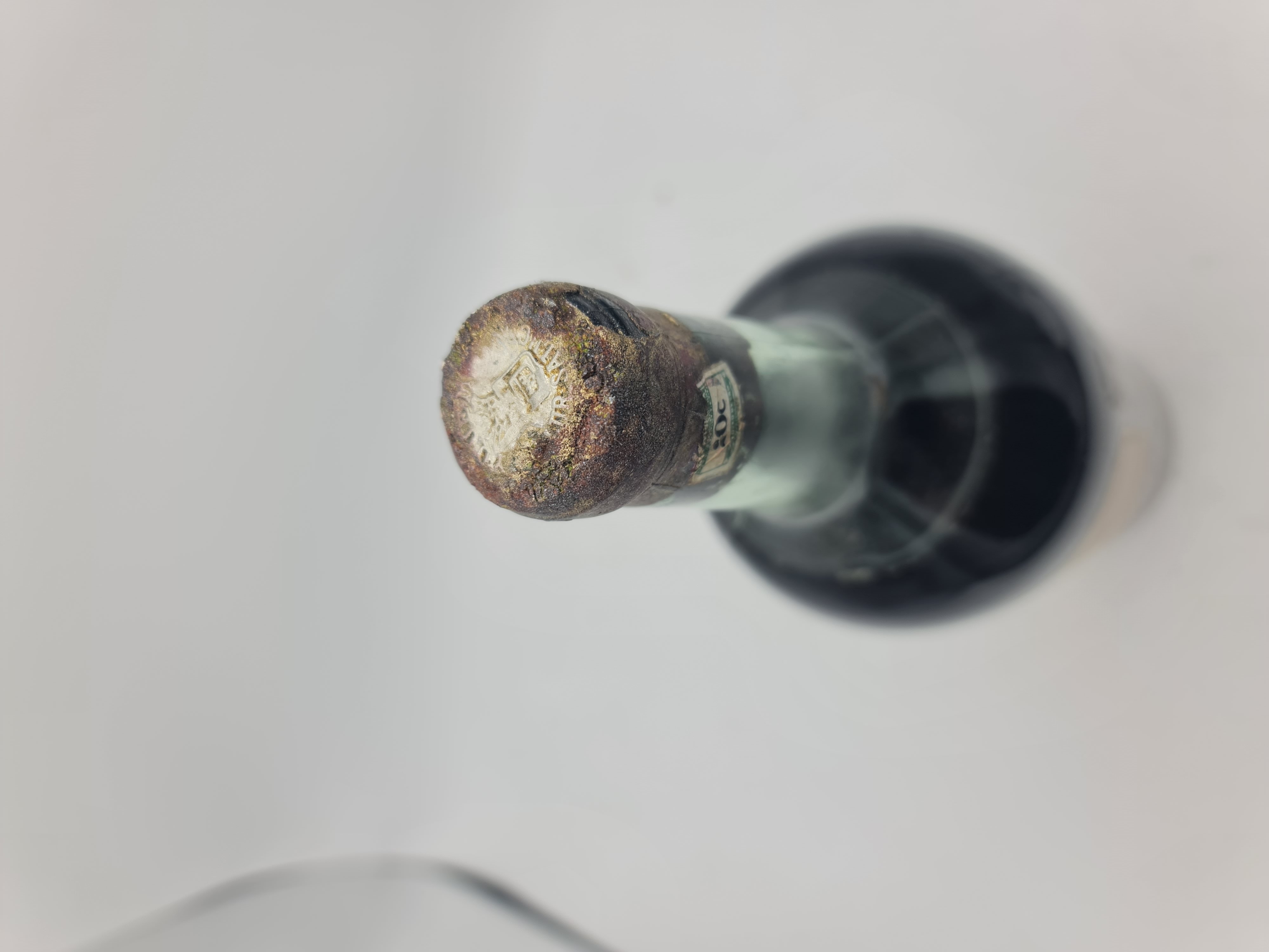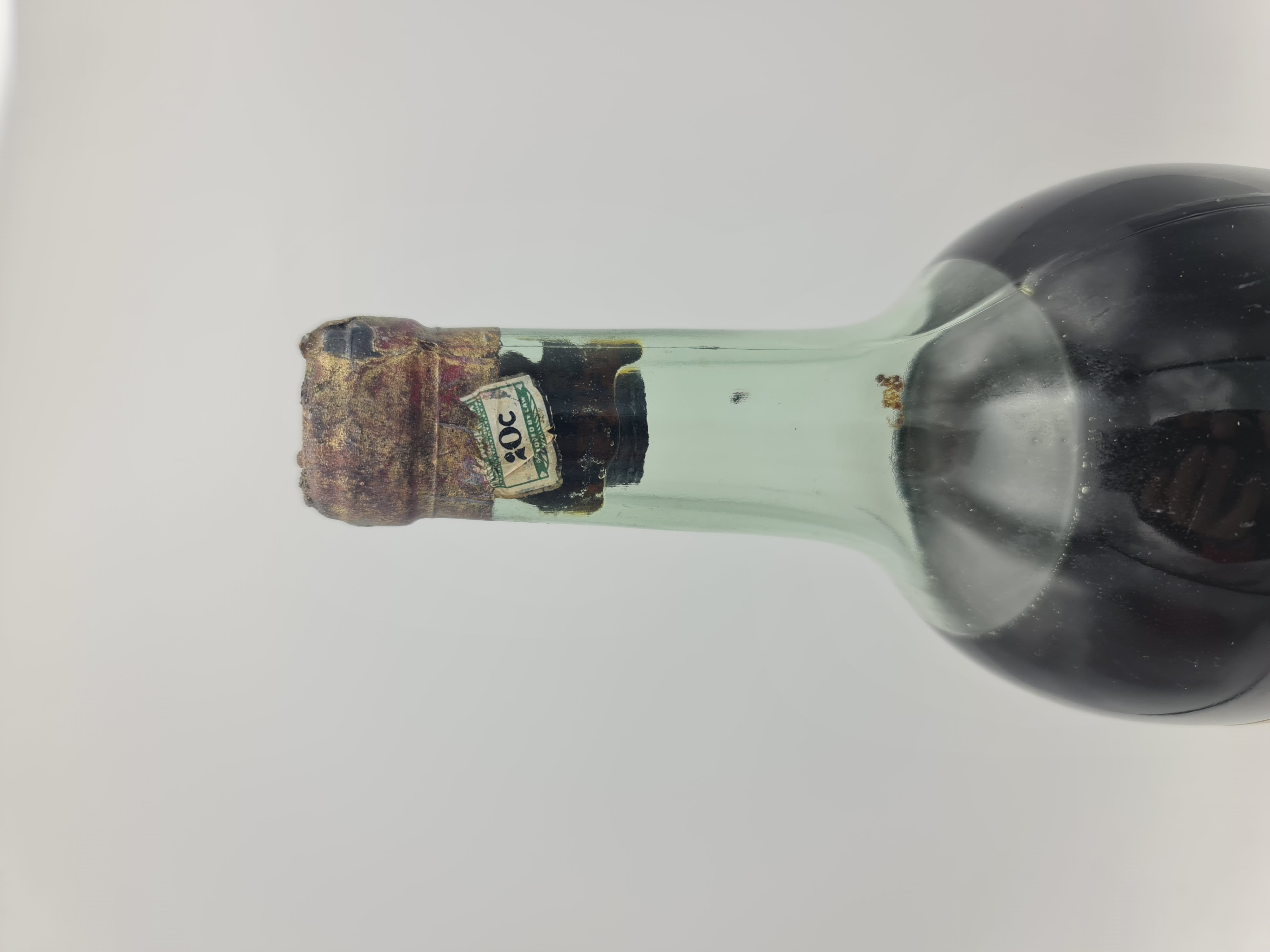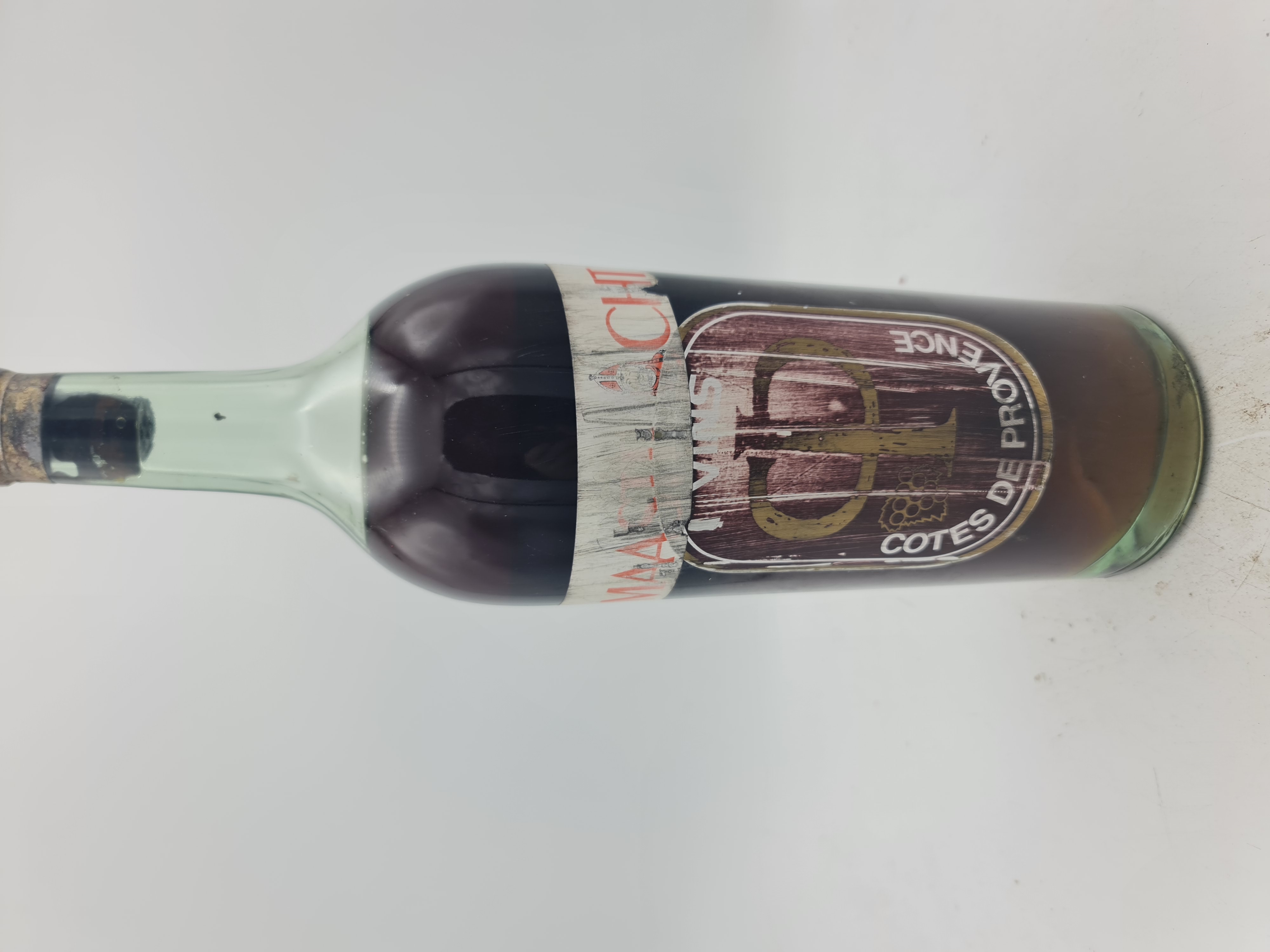 Füllniveau mid shoulder, Kapsel beschäggt und Etikett beschädigt.